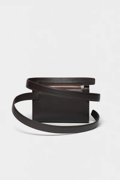 Leather pouch zipped to a belt that slides through a back coulisse, allowing it to be worn crossbody or adjusted around the waist. Designed for versatile styling and practical use, with a clean, minimal silhouette. Crafted from smooth, high-quality leather.