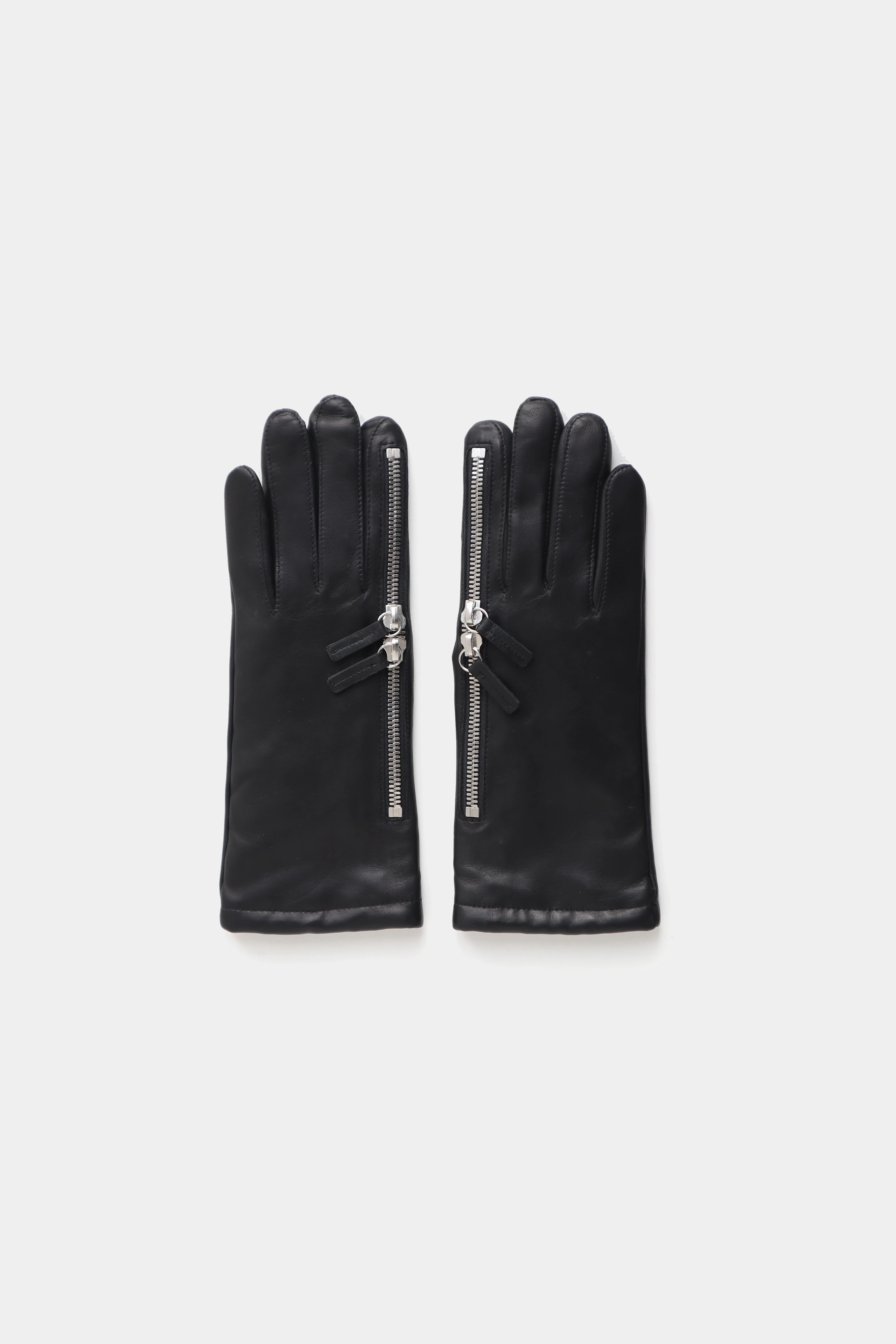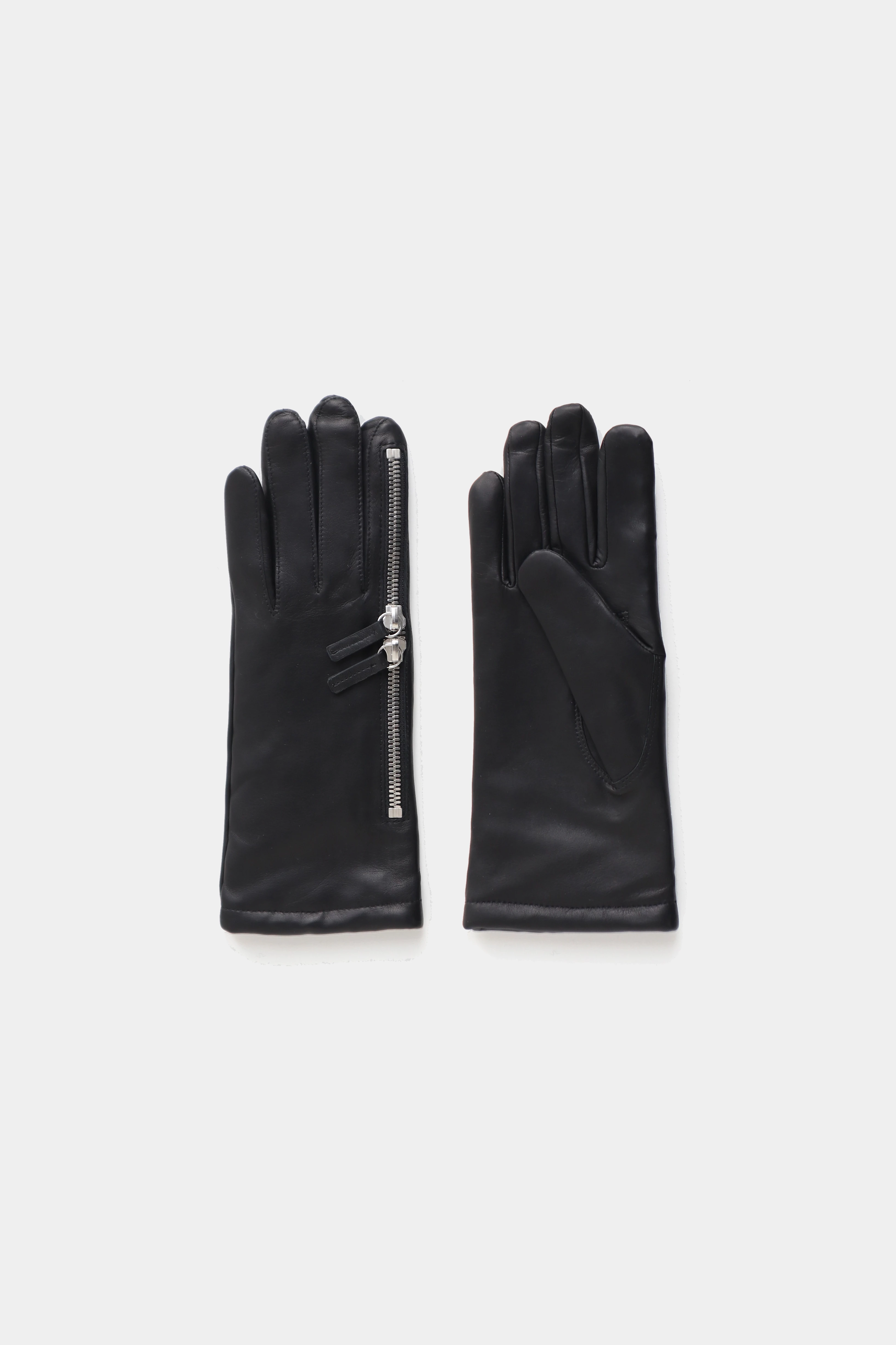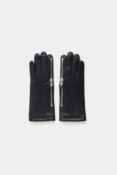 Lambskin gloves with a double zipper providing access to a flat pocket on the back of the hand and to the index finger. Designed for discreet storage and practical use. Crafted from soft leather with a clean, minimal silhouette.